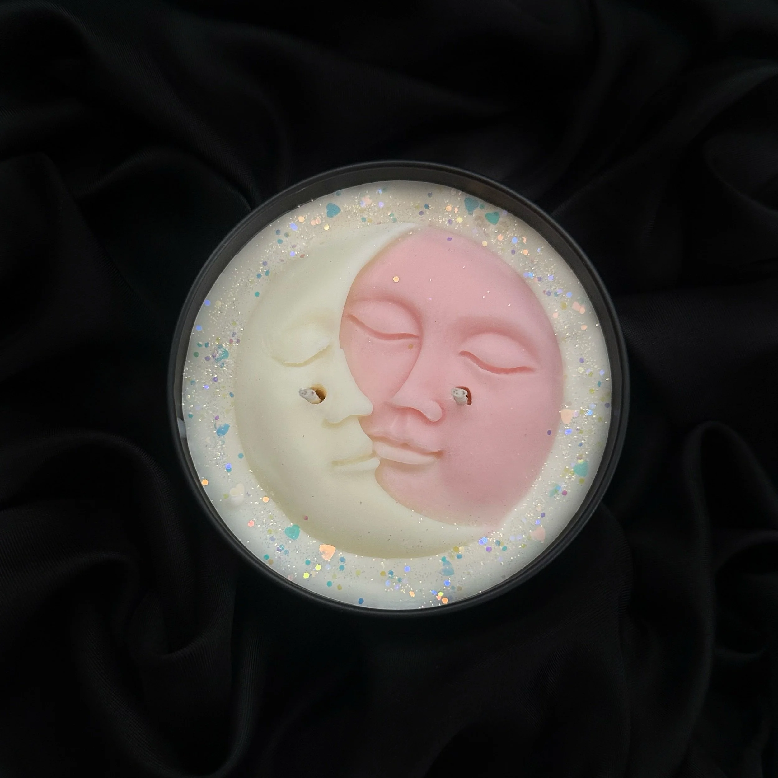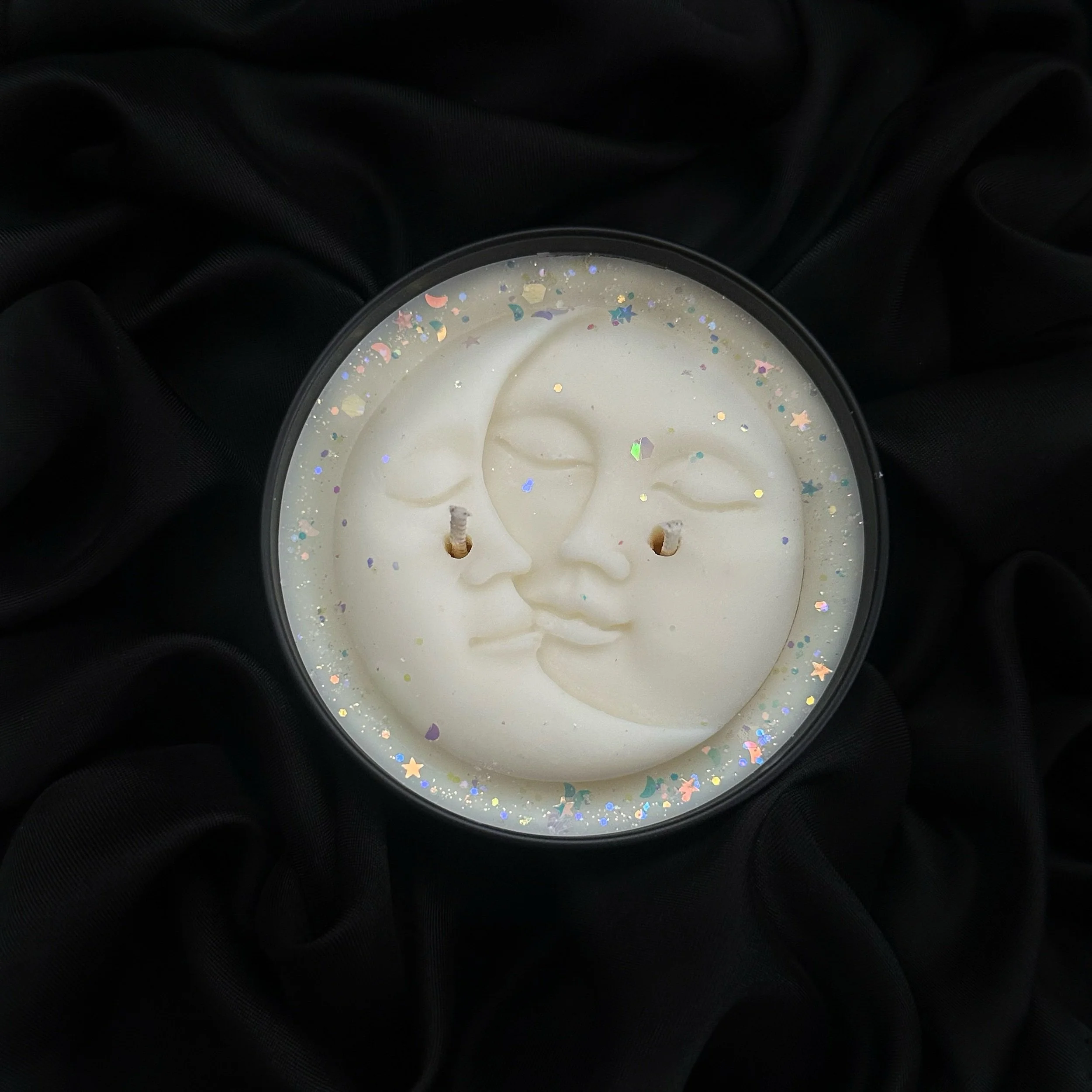 Celestial is a double wick, 8 oz, soy wax candle scented with cherry eclipse. It has a white base color, is topped with a sun/moon wax embed which comes in three colors options (white, pink, purple), and biodegradable glitter. It is placed in a black tin vessel with a matching black lid.