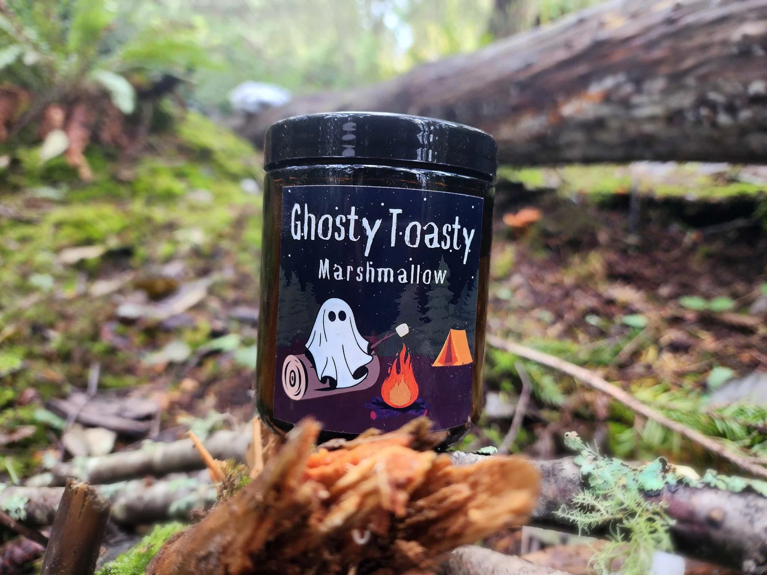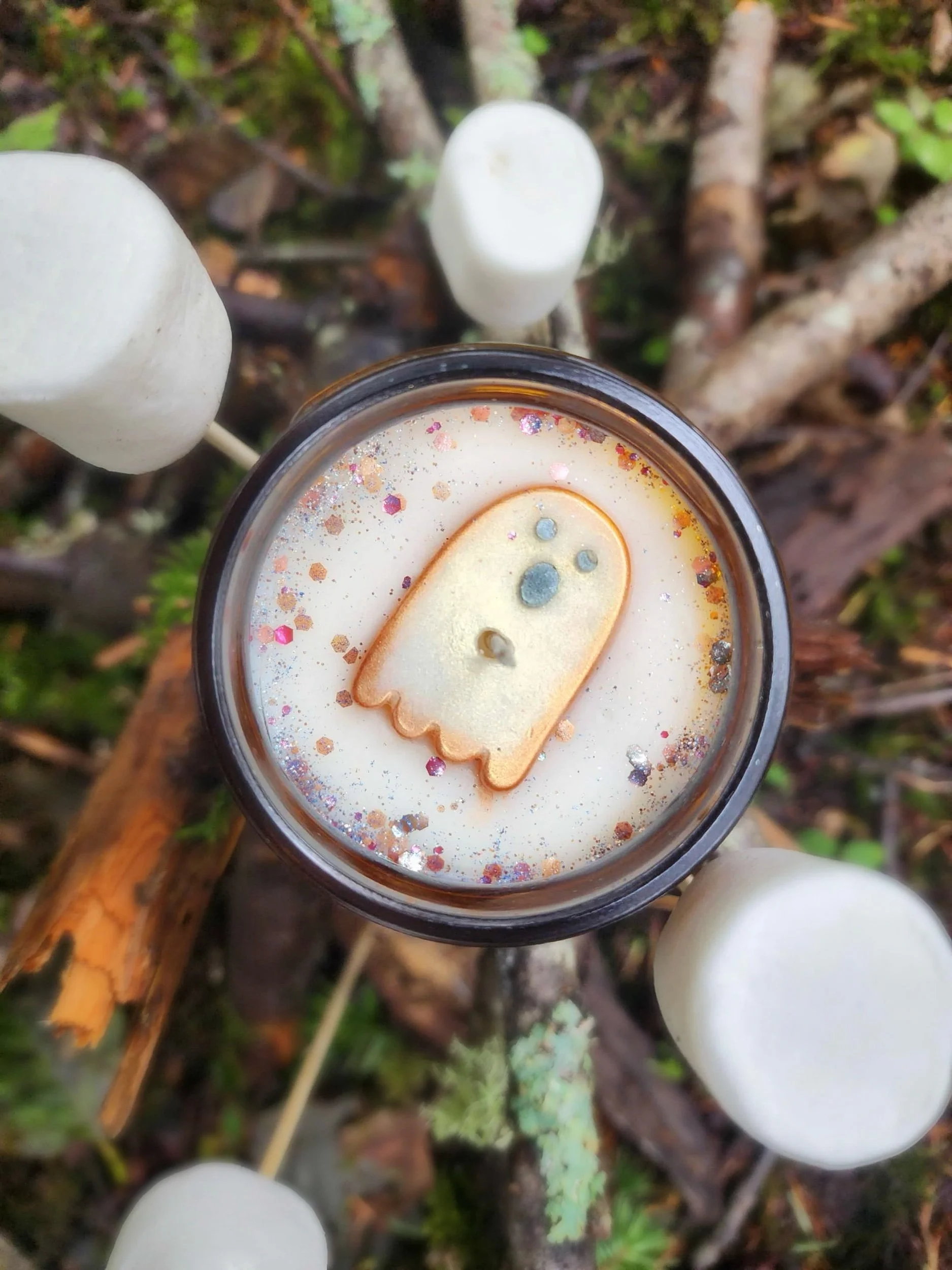 Ghosty Toasty is a single wick, 8 oz, soy wax candle. It is scented with a custom fragrance blend of sweet pine smoke and roasted marshmallow. It has a white base color and is topped with a hand painted toasted ghost wax embed, and biodegradable glitter. It is placed in a glass amber jar with a plastic black lid.